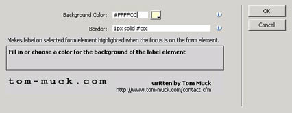 - Select Tom-Muck.com > Highlight Form Labels from the behaviors panel. You'll see this dialog box: