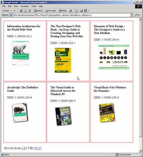 7. The Horizontal Looper works with all of the standard "Recordset Paging" Server Behaviors that ship with Dreamweaver, including Move to Previous, Move To Next, and the rest. It also works well with the Recordset Navigation set of behaviors: Pages List , Links List , and Navigation Links . We've added Links List and the built in Dreamweaver object Recordset Navigation Bar to the finished page shown here.