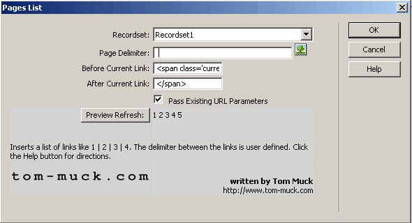 - Choose Server Behaviors > Tom-Muck.com > Recordset Navigation > Pages List.
