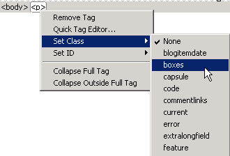 The set of links is contained in a paragraph tag with a class name of "boxes". The href attribute would contain the page name, which is generated automatically by the server behavior. The boxes class looks like this, and is put into the <style> tags in the head: