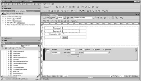 - Open your login page. On this page you'll need a textfield for Username and a textfield for password. Make sure the password field is set up properly as a password-type text field. You can do this in the property inspector by clicking the "Password" radio button. Also, you will need a checkbox for the "Remember Me" function.