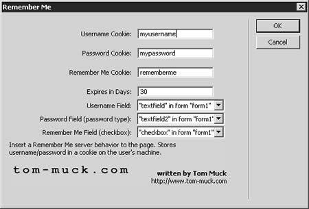 - Go to the Server Behaviors menu and click Tom-Muck.com >> Remember Me. This will bring up the following dialog box: